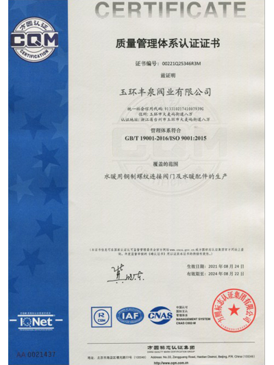 MORE+玉環豐泉閥業有限公司坐落于閥門之都 - 浙江玉環,是一家集研發、設計、生產、銷售服務于一體的綜合性公司。公司地處浙江東南沿海,緊靠國家二類港口大麥嶼港,離臺州機場58公里,離溫州機場30多海里,交通十分便利。公司創建于1988年,專業生產銅制閥門、水暖配件及管件;產品廣泛應用于太陽能、冷熱水、煤氣管件及采暖等建設項目...